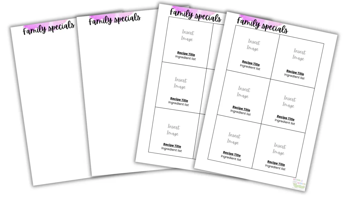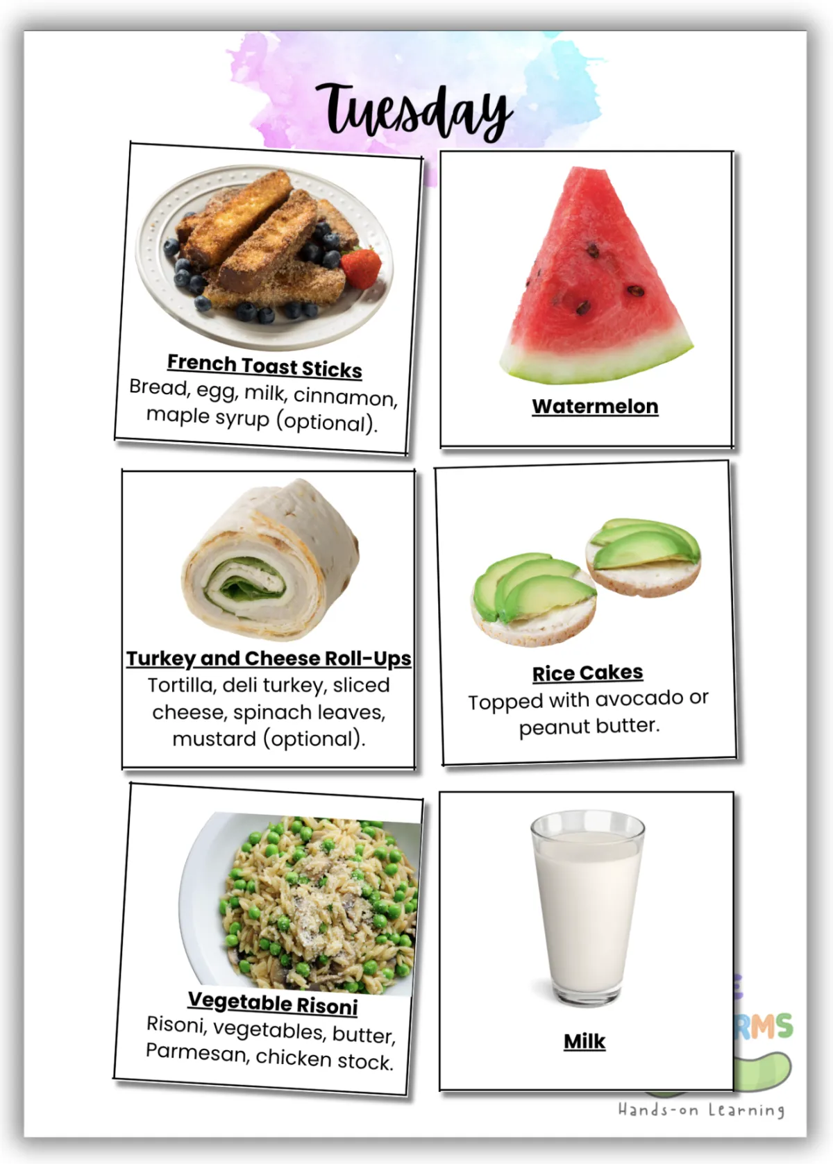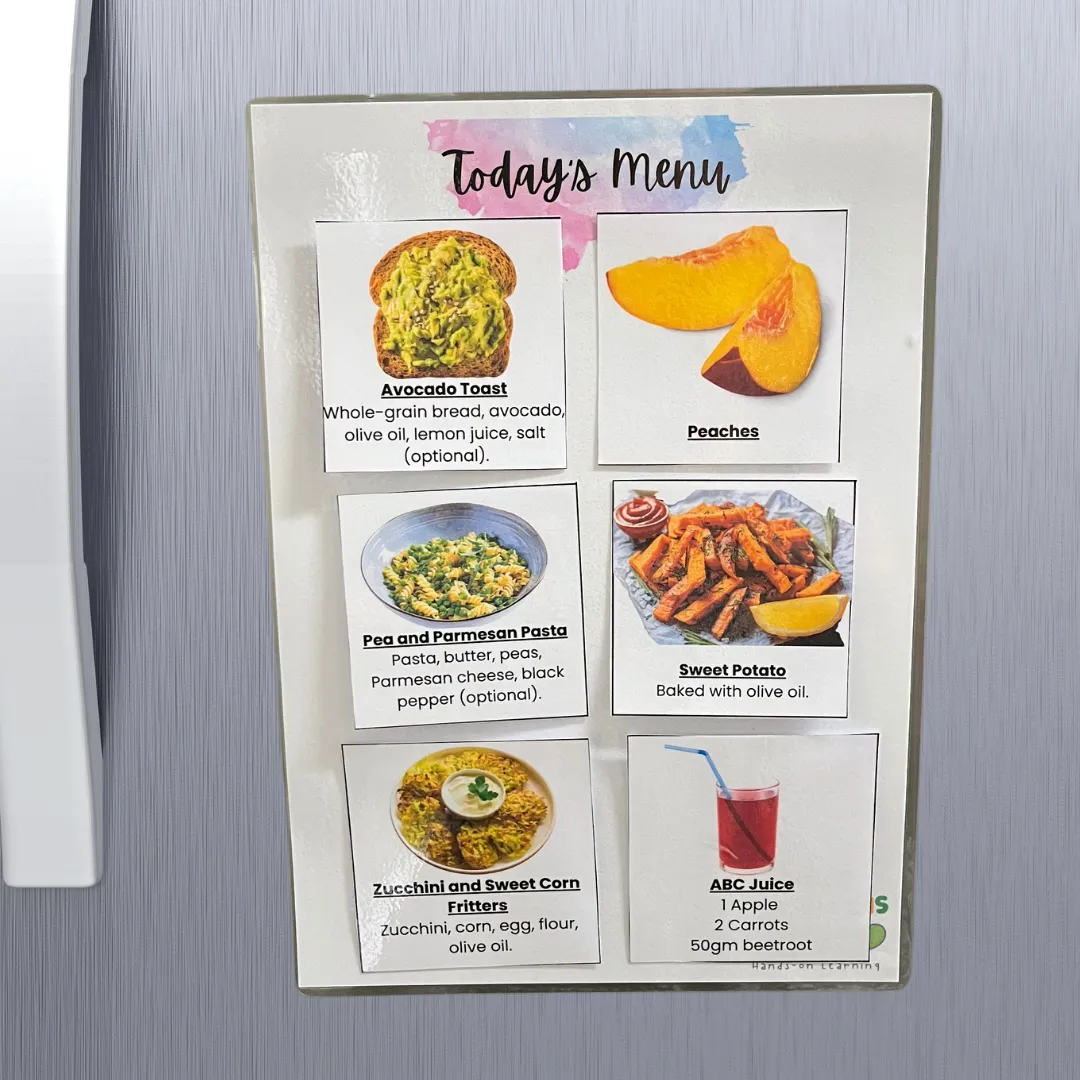 Simply print the pages at home or a local print shop. You can cut out the food visuals, laminate them for durability, and organize them by meal type or food group. Many parents create a binder, wall chart, or tabletop choice board.