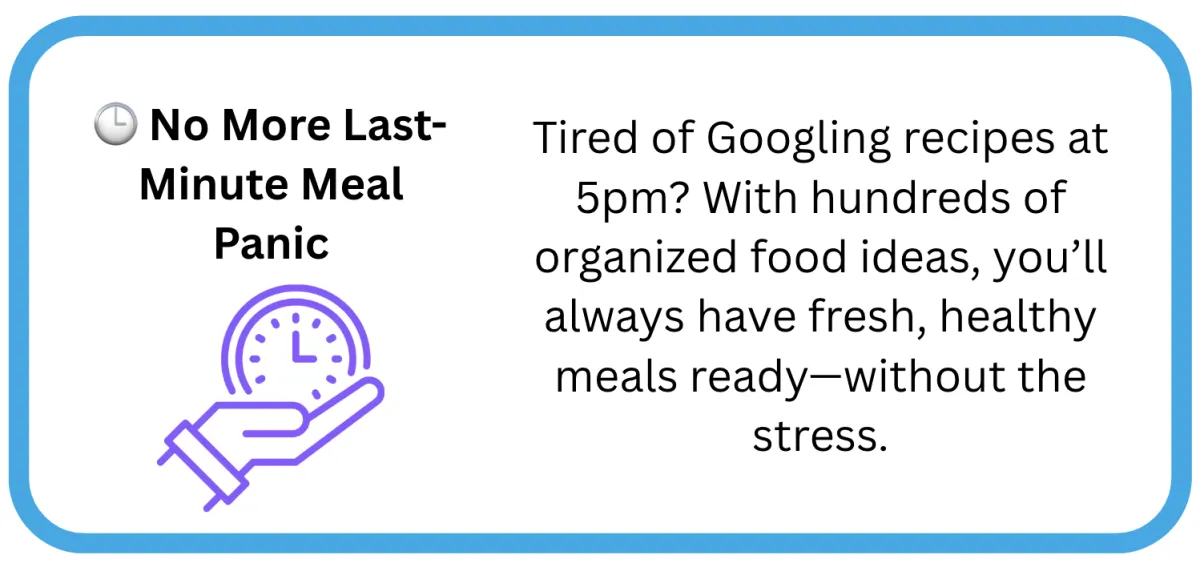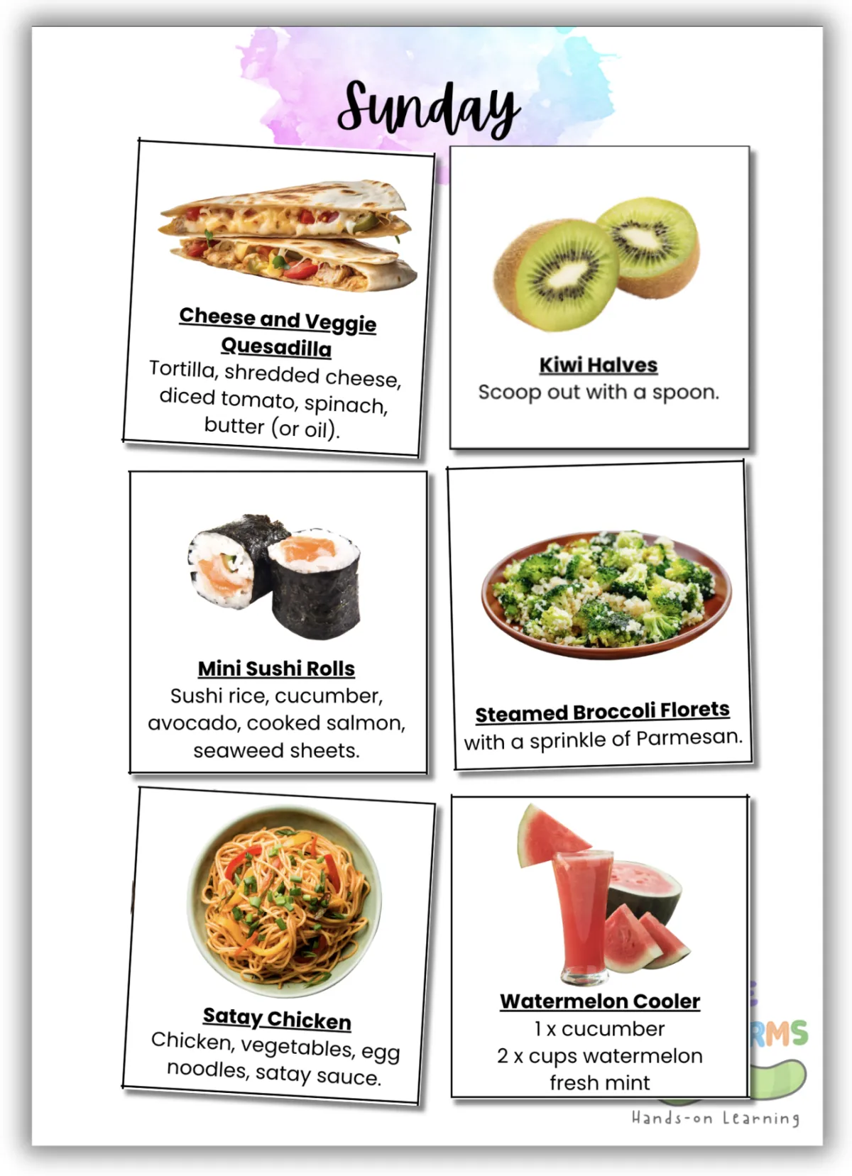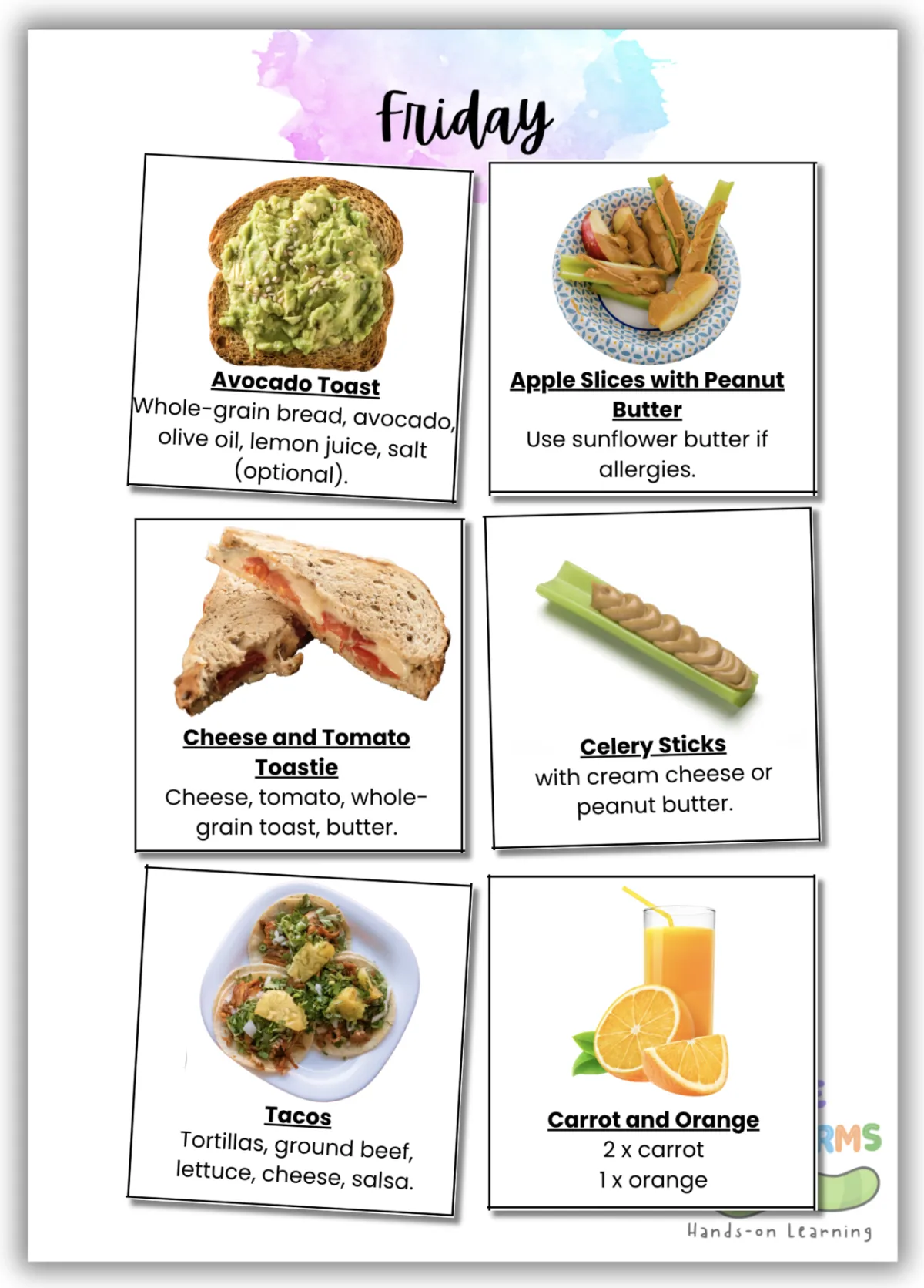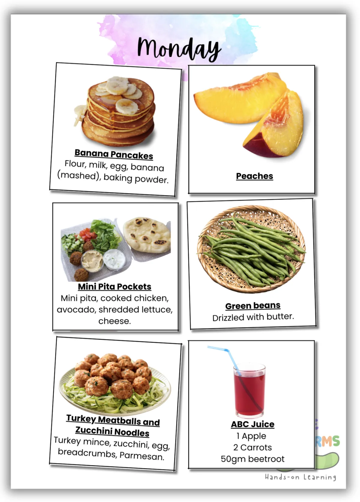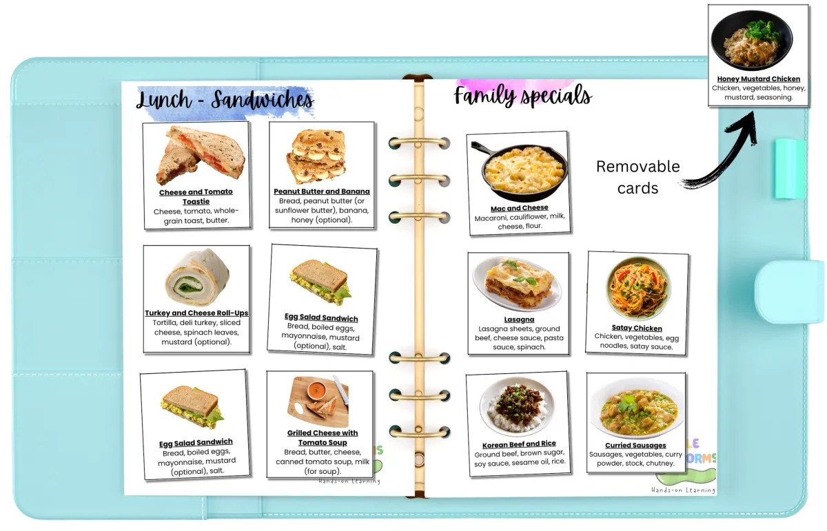 With hundreds of real food options (organised by meals + food groups), you can create interactive menus, snack boards, and routines that make mealtimes calm and stress-free.